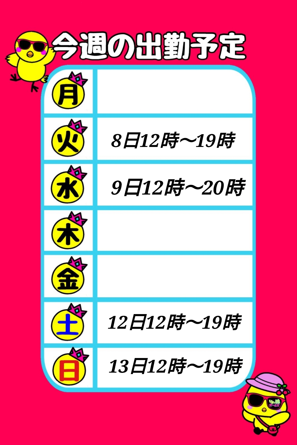次回土曜日の12時~19時迄の出勤です。