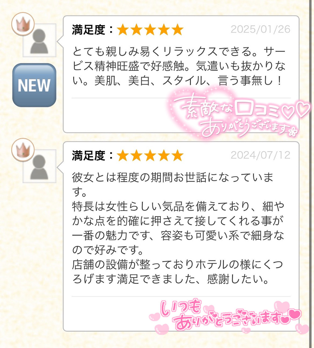たっぷりぬるぬる出来たり、海外旅行やラグジュアリーホテルなどのお話色々聞かせて&教えて頂けたり、チップのお心遣いまで頂いたり嬉しかったです、皆様有難う御座います(><)🙇♀️💖