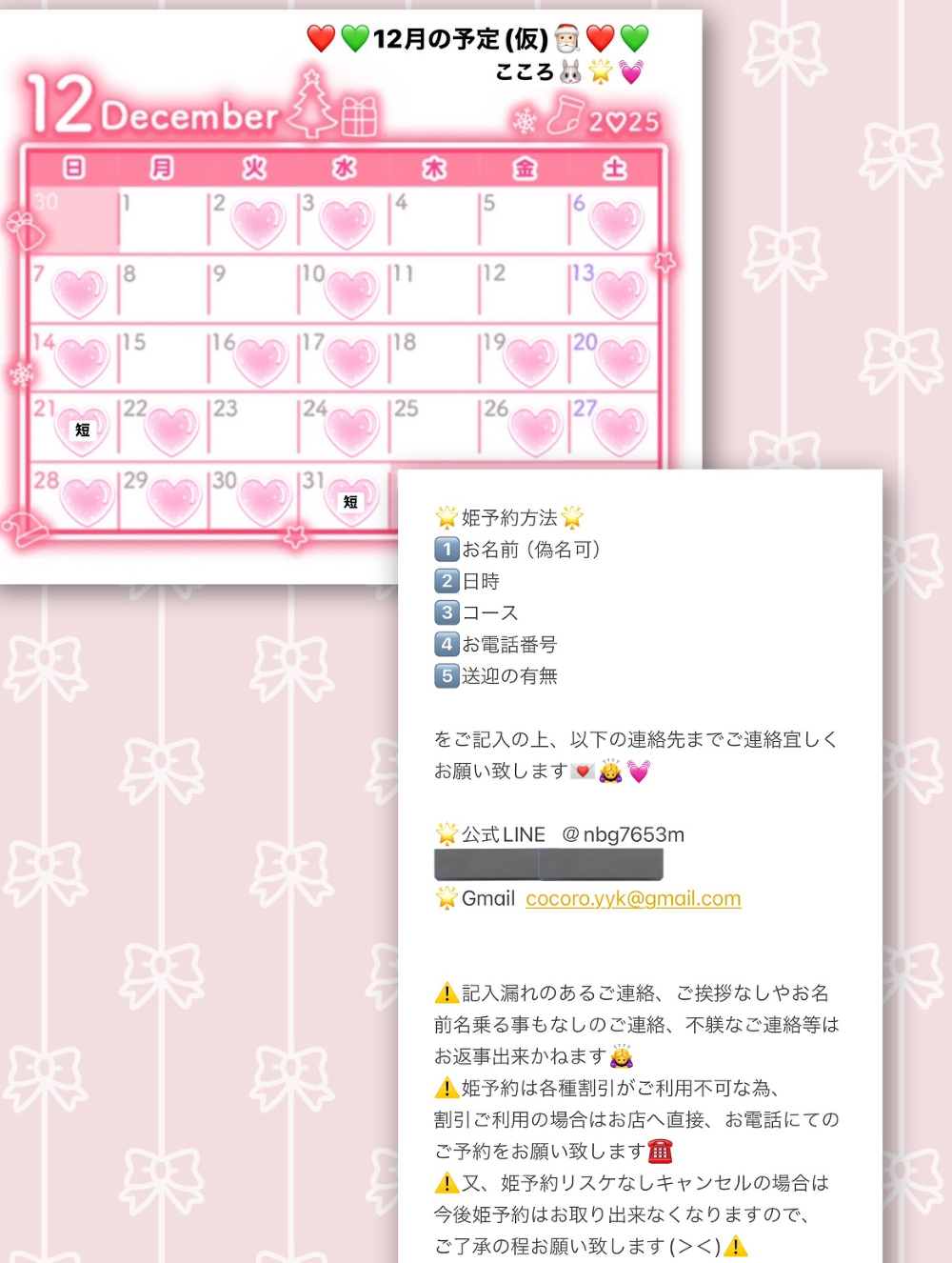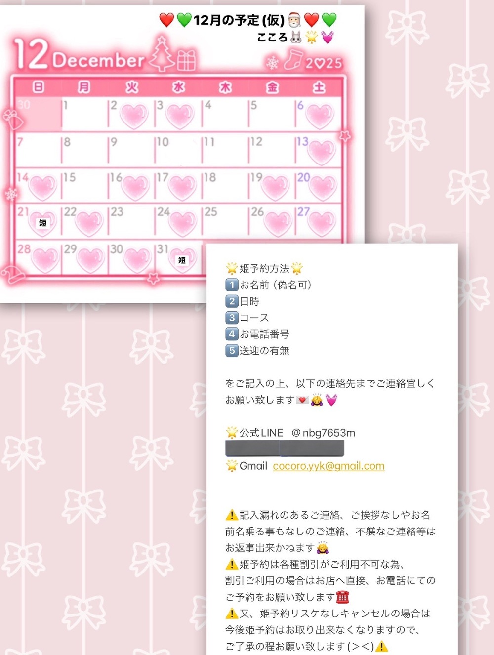 今月の出勤予定と姫予約方法を画像3枚目に添付しておきます、宜しくお願い致します🎅🏻🐰🌟💓