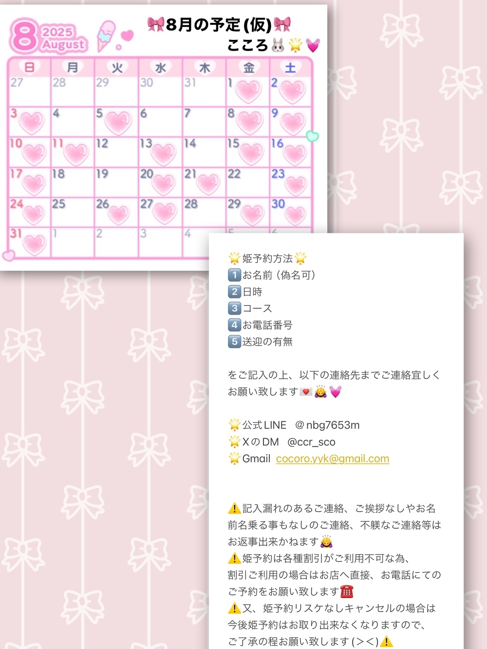 🗓️スケジュールについて🗓️8月も今のところ基本的には月木お休みの、他は11:00〜23:30(最終受付 22:00頃)の出勤予定です🎀(変更の可能性あり🙇♀️)(画像3枚目参照)