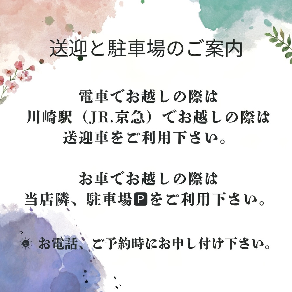 川崎駅(JR.京急)送迎車ご利用下さい。